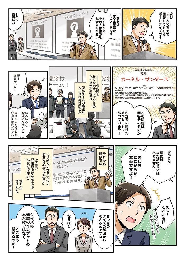 今回の研修でBizクイズについて初めて知りましたが、実際に体験してみて楽しくチームメンバーと交流できるだけでなく、 時事的な知識や思考力を培うことができる研修だと感じました。非常に充実した研修でした。